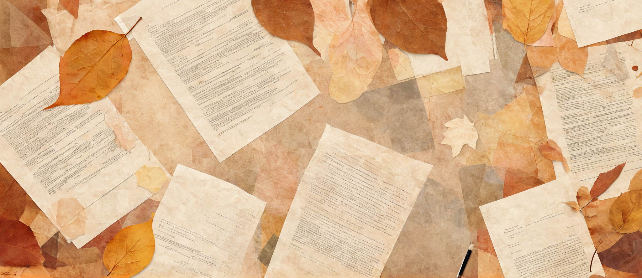 Soft autumn tones, subtle digital textures, scattered documents and data fragments, a modest central figure symbolizing experience and learning, abstract shapes representing information flow, warm and neutral color palette, understated composition, in the background, clean lines, open spaces,, no people, no text, no logos, BREAK”